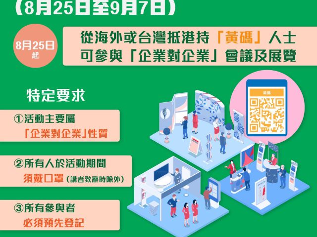 政府早前宣布,现行社交距离措施大致延续,但会调整进入场地限制,让从海外或台湾抵港人士处于「黄码」期间,在符合特定要求下参与「企业对企业」会议及展览。新一轮社交距离措施会于今日(25日)至9月7日期间生效。 政府指,考虑到业内人士参与「企业对企业」会议及展览的性质与上班类同,有别于其他大规模群组聚集,因此在平衡社会及经济活动需要后作出有关调整。 政府又强调,疫情持续高企,市民须继续严守社交距离措施,并尽快安排长者和儿童接种疫苗,如有不适亦应尽早求医。