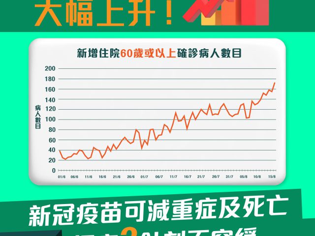 本港第五波疫情严重,昨日(18日)确诊个案突破6000宗。政府在社交专页「添马台」发文表示,长者入院人数大幅上升,由6月初每日约40名,攀升至8月中的约180名;而在严重或危殆病人中,更有逾8成为长者,形容情况令人担忧。 政府指出,感染Omincron绝非一般伤风感冒,高危群组如长者及长期病患者病情可急速恶化,根据世界各地的科学数据均显示,新冠疫苗对减少重症和死亡非常有效,强调打齐3针实在刻不容缓,呼吁市民应爱护身边长者,尽快替他们安排接种疫苗。