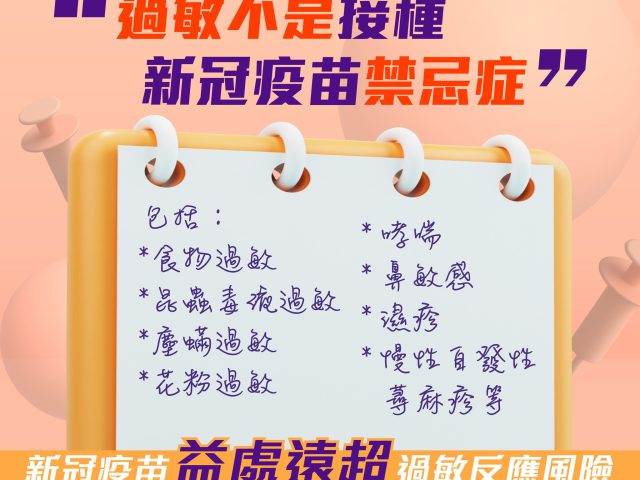 本港第五波疫情持续反弹,昨日新增5757宗确诊,创4月以来新高。政府今日(18日)表示,过敏不是接种新冠疫苗的禁忌症。 政府指出,五个儿科医学组织发出联合声明,指多种儿童和青少年可能有的过敏反应并非接种新冠疫苗的禁忌症,打针前亦无需转介过敏科医生进行评估。学会又指,新冠疫苗安全有效,能预防感染后的重症、死亡和中长期后遗症,对儿童和青少年的益处远超可能产生严重过敏反应的风险。 政府强调,儿童抵抗力弱,家长不应再犹豫,应尽快在冬季感染高峰前带孩子打针,加强保护。