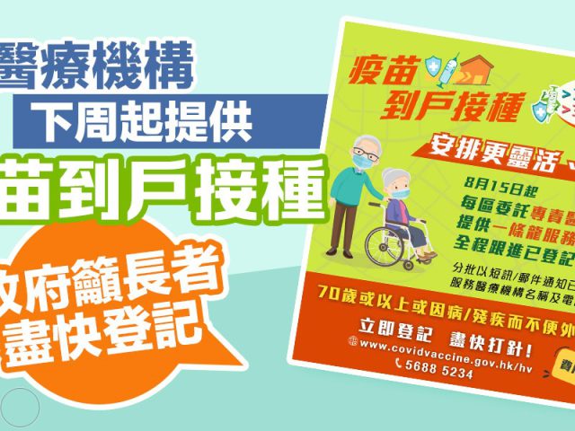本港第五波新冠肺炎疫情持续,政府今日(13日)在社交专页「添马台」发文,指下周一(15日)起,「疫苗到户接种服务」将在每区安排专责医疗机构提供一条龙服务,由预约日期、行程编排到上门打针,均由相关医疗机构全程跟进,令服务更灵活、更贴心。 政府将按接种时序,分批以短讯或邮件通知市民专责医疗机构的名称及查询电话。政府又呼吁尚未接种新冠疫苗的70岁或以上长者,或因病患/残疾而行动不便的人士把握机会,尽快登记上门免费接种科兴疫苗。 政府日前宣布,委托13间医疗机构,续为全港已登记疫苗到户接种服务的长者和有特别需要市民提供上门接种新冠疫苗服务,医疗机构不会向接种者收取任何费用。 (点此登记)