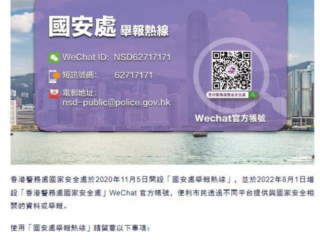 香港国安处微信官方帐号今启用市民可作举报