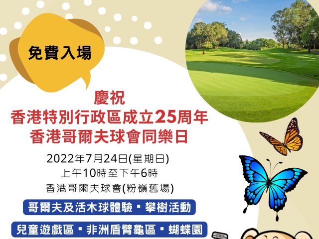 为庆祝香港回归祖国25周年,香港哥尔夫球会将于本周日(24日)上午10时至下午6时,在粉岭球场举办「香港哥尔夫球会同乐日」。 活动当天,公众可以免费进入粉岭旧球场,参观「蝴蝶园」,探访非洲陆龟,在百年球场散步及打卡,更有攀树体验活动和树木导赏等丰富活动,让一家大小在香港逾百年历史的国际级球场度过悠闲的一天。 有兴趣参加的市民,须今日(20日)上午10时于球会网站预先登记,额满即止。所有12岁或以上之入场人士需符合「疫苗通行证」要求。 日期:2022年7月24日(星期日) 时间:上午10时至下午6时 地点:香港新界上水粉锦路公路1号 交通:免费穿梭巴士由上水港铁站C出口直达至粉岭球场,服务时间由活动当天上午10时至下午5时,每15分钟一班车;入场人士亦可在上水地铁站乘搭77K巴士、57K小巴或的士前往球会,如步行则需15至20分钟。 温馨提示:如3号或以上热带气旋警告信号或红色或黑色暴雨警告信号生效,「攀树体验活动」将取消。