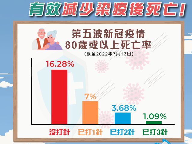 香港第五波疫情持续反弹,昨日(18日)新增3436宗确诊,连续6日破3千。政府表示,疫情持续升温,长者感染新冠病毒后死亡风险极高,必须特别提高警觉。 政府指,第5波疫情中,80岁或以上长者未接种疫苗的死亡率为16.28%,即约6个中有1个;而打了3剂的死亡率则大幅减至1.09%,即约100个有1个。现时80岁或以上长者只有不足4成打了3针,情况令人担心。 政府强调,为保护家中「老友记」,不要再迟疑,尽快安排他们打齐3针。如从未感染新冠病毒,已打2针长者隔3个月便可打第3针;如属免疫力弱,打了第2针4星期后便可打第3针。长者在打了3剂后隔3个月可打第4针,加强保护。