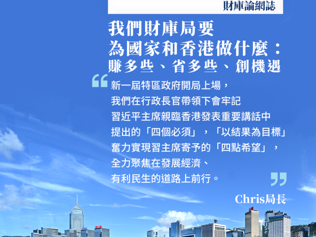 香港财经事务及库务局局长许正宇今日(8日)发表网志,表示新一届特区政府开局上场,在行政长官带领下会牢记习近平主席亲临香港发表重要讲话中提出的“四个必须”,“以结果为目标”奋力实现习主席寄予的“四点希望”,全力聚焦在发展经济、有利民生的道路上前行。在财库局要为国家和香港做些什么方面,答案只有一个,就是为香港增值,为香港赚多些、为大家省多些、为未来创造更多机遇。 许正宇说,财库局要研判局势,找准定位。面对国际风云大变局,巩固及提升香港国际金融中心的地位至关重要。香港金融市场未来应继续担当全球化的“捍卫者”及“促进者”,当好国际金融枢纽的角色,为国家经济与世界联通“修桥搭路”,让寻求发展与增长的投资者分享国家经济引擎的巨大红利。 在“为香港赚多些”方面,许正宇指,财库局的核心要务就是通过积极的政策措施,做大市场。下一步会与内地监管机构研究开展“互联互通2.0”的新时代,配合国家及市场所需,检视及优化项目,包括更多在港上市中概股纳入“南向通”及增加海外投资者风险管理工具的选择。此外,为家族办公室提供税务优惠将强化香港作为“聚宝盆”的资产及财富管理中心地位,通过修改法例开拓了新的保险相连证券市场,为机构投资者增加投资选项。 在“为大家省多些”方面,许正宇指出,财库局会通过审视内部程序和活用科技,提高效率及优化治理,减低各项成本及费用,为社会带来切实效益,为大家省多些。政府致力与更多税务管辖区签订全面性避免双重课税协定,正处于较成熟讨论阶段的税务管辖区大约有7个,现时在香港或这些税务管辖区营运的大型跨国企业集团超过60家,将可受惠这些新签订的协定。 在“为未来创造更多机遇”方面,许正宇提到,香港背靠祖国,如站在巨人肩膀上,应将视野及眼界放得更高更远,推动人民币国际化是金融发展的重中之重。继续善用香港作为全球离岸人民币业务枢纽的角色,持续助力人民币国际化的策略,研究活化离岸人民币生态圈的更多可能性,强化其于资本市场的应用。此外,已与前海管理局建立紧密沟通合作机制,未来将以创新突破的方式联合推出措施,协助香港金融业界把握前海机遇。 许正宇强调,随着香港打开由治及兴的新篇章,将在行政长官领导下让财库局成为“行动型”及“执行型”的政策局,以切实的政策措施为香港赚多些、为大家省多些及为未来创造更多机遇。 点击查看香港财经事务及库务局局长许正宇网志全文