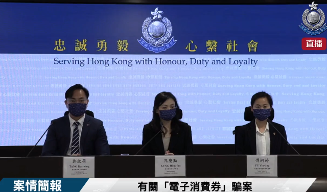 警方今日(22日)公布一宗与政府「电子消费券」有关的骗案,案件中警方共拘捕9名男女,包括7男2女,年龄介乎16至46岁,其中7人相信与一个犯罪集团有关,部分人有黑社会背景。另外有2人因涉及盗取朋友及前伴侣消费券被捕。 警方表示,自今年4月起关于第一期电子消费券已经接到64宗涉嫌诈骗案件,涉及款项超过30万元,经过调查发现其中46宗案件相信与一个犯罪集团有关,在锁定一些涉案人士身份后,昨日展开行动,拘捕该犯罪集团的7名人士,包括集团主脑及相关店铺负责人。 根据警方调查,有骗徒涉嫌以不法手段取得他人的个人资料,之后冒充受害人以邮递方式,向当局申请更改收取消费券的账户,然后使用无实名登记的电话号码设置新的支付平台账户,以接收当局的确认通知及电子消费券。该犯罪集团中有4人,在政府派发消费券的首两天使用46次电子消费券,大部分在3间商户怀疑合谋进行套现交易,涉及款项21万元。