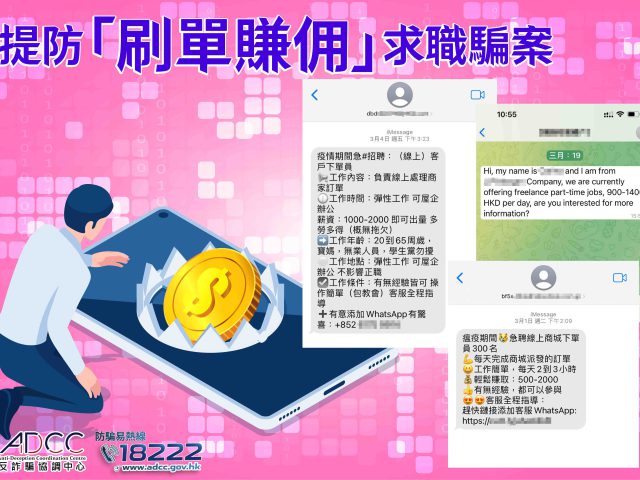 日前,再有市民堕刷单骗案陷阱。香港警方昨日(15日)进行代号为“冲霄”的反科技罪案及“搵快钱”罪案行动,拘捕9人涉嫌与10宗求职骗案有关。 湾仔警区重案组第二队督察卢伟德指,警方经情报分析及深入调查后,于昨日(15日)展开名为“冲霄”反科技罪案及搵快钱拘捕行动。行动中在港九新界各区以欺骗手段取得财产罪拘捕9人,涉嫌与10宗刷单用求职骗案有关。被捕人士分别是7男2女,年龄介乎18至55岁,全部持有本地身份证,报称职业分别是运输工人、厨师、餐厅经理,售货员及无业等。 他指,涉及10宗案件,受害人总共损失金额高达港币190万元,每宗案件损失金额由85万港元至1万港元不等。今次行动中主要针对打击求职骗案,受害人通常在手提电话、网上社交平台或即时通讯软件,收到骗徒传送的讯息招聘“刷单员”,讯息通常标榜可赚取高佣金、无特别学历及经验,及可以在家工作等作为招徕。 香港警方提醒市民,骗徒的招聘广告以“搵快钱”、“高人工”、“即日出粮”或“在家工作”作招徕,对应征者年龄、学历及履历亦没有特别要求。同时,骗徒于刊登招聘广告或短讯推广时,亦不会提及实际职位或工作内容,并只提供即时通讯软件或手机号码联络方法。骗徒更会于受害人初次存款后以发放佣金来获取受害人信任。警方呼吁市民,对于不明来历的短讯或有任何怀疑,应致电“防骗易热线”18222。