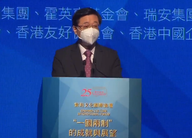 由紫荆文化集团主办的“紫荆文化国际论坛——‘一国两制’的成就与展望”今日(16日)举行。候任行政长官李家超出席并致辞。他表示,“一国两制”在过去25年来得以成功贯彻落实,未来香港在国家的支持下,将继续加强与国际的联系,提升作为国际城市的地位。 李家超提到,无其他事情比香港在2019年经历的骚乱及暴力,加上外国势力的干预所造成的伤害更痛苦。不过,他引述早前到北京接受任命时,国家主席习近平的一番话,指“一国两制”在过去25年即使面对挑战,但在香港仍然成功落实,而“一国两制”是受宪法及基本法保障,确保港人的自由及长期繁荣稳定,而香港已经由乱及治,正处于繁荣的关键阶段。