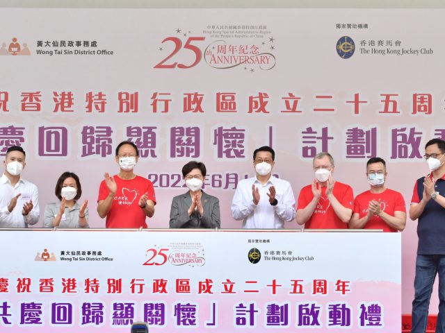 行政长官林郑月娥今日(11日)出席「共庆回归显关怀」计划启动礼致辞指,今年计划主要分为三部分,首先是探访30万个基层家庭,当中有独居长者、双老家庭,以及有特别需要的家庭;另外两部分,分别是安排约8万名基层市民参加全港性的庆祝活动,以及安排约12万名来自弱势社群的市民参加地区举办的庆祝活动。举办单位亦会按需要为参加者安排免费交通、膳食和入场券。 林郑表示,今年是香港回归祖国25周年,对国家、特区和香港市民来说,都是一个非常有意义和值得纪念的日子。今年的庆祝主题是「砥砺奋进廿五载携手再上新征程」——砥砺奋进,一直是香港的成功之道。回归25年来,我们曾面对不少考验,全赖国家大力支持,以及广大市民努力不懈,香港在多方面都取得辉煌成就。展望将来,深信大家亦会继续以携手奋进的精神,迈步向前,再创佳绩。 早于香港回归十周年时,特区政府已把社区关怀注入庆祝活动,以达致普天同庆的目的。一如以往,今年的「共庆回归显关怀」计划亦是由民政事务总署统筹,18区的非政府机构及地区团体全力协助推行。而在这两个星期内,行政长官将会和各司局长会联同参与计划的各个非政府机构及地区团体,走访18区探访基层家庭,派发25周年庆祝活动礼物包,以表心意。