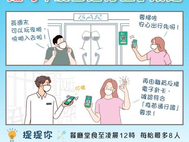 香港特区政府今日(3日)在社交专页“添马台”发文,呼吁市民在端午节及紧接的周末(6月3日至5日)长假期勿松懈,应严守防疫规例,在进入餐厅、酒吧等处所前,紧记扫描“安心出行”二维码,并出示电子针卡或康复纪录二维码供职员反扫验证,确保符合第3阶段“疫苗通行证”规定。当局会加强巡查,严正执法。 政府提醒,进入餐厅、酒吧后亦要注意防疫规定,不要违反同坐一台人数的上限(餐厅每台最多8人,酒吧最多4人),在非餐桌范围或非饮食时要佩戴口罩,现场不可有表演和跳舞活动。 政府强调,违反防疫规例或“疫苗通行证”规定最高可被罚10000元或被处定额罚款5000元。