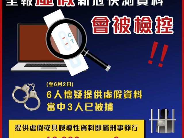 香港特区政府在社交专页“添马台”发文,指新冠快测申报系统近日呈报的个案,经核酸覆核验出阴性比例增多,至昨日(2日)发现6人怀疑刻意提供虚假资料,已交由警方跟进,其中3人被捕。 政府指,个别市民怀疑为取得康复纪录二维码以使用“疫苗通行证”,呈报旧数据或虚假资料。政府批评有关的行为极不负责任,亦严重影响抗疫工作。必定会严肃跟进任何呈报虚假资料个案。违者一经定罪可被罚1万元及监禁6个月,提醒市民切勿以身试法。 卫生署卫生防护中心传染病处主任张竹君昨日表示,5月30日呈报的快测阳性个案为150宗,其中31宗在核酸检测覆检呈阴性,占比约21%,较一周前平均17%的占比为多。她也重申,任何人明知而向当局提供虚假或具误导性的病毒测试资料,均属违法。