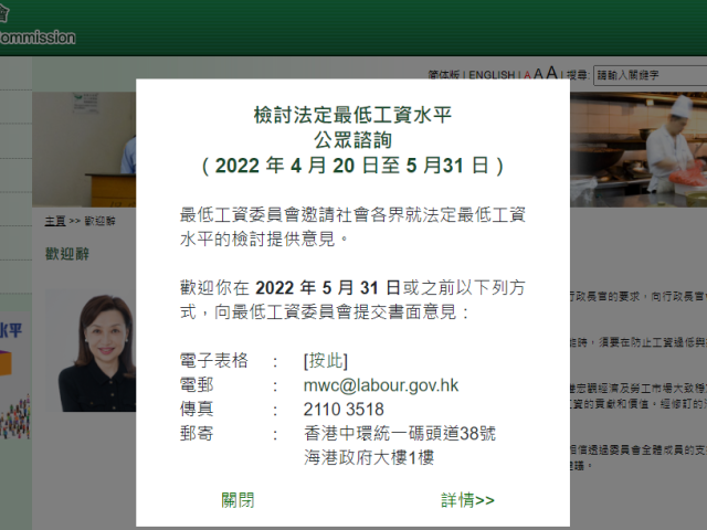 香港最低工资委员会今日(18日)吁请公众及相关组织留意,检讨法定最低工资水平的公众咨询将于本月31日结束。 委员会于今年4月20日展开为期6星期的公众咨询,欢迎社会各界,包括公众及相关组织,在本月31日或之前就检讨法定最低工资水平,透过委员会网页的电子表格、电邮([email protected])、传真(2110 3518)或邮寄(中环统一码头道38号海港政府大楼1楼最低工资委员会),向委员会提交书面意见。市民亦可致电2852 3862联络委员会秘书处。 委员会早前表示,行政长官已根据《最低工资条例》(第608章),要求委员会于本年10月31日或之前提交法定最低工资水平的建议报告。按照《最低工资条例》,委员会在执行其职能时,须在防止工资过低与尽量减少低薪职位流失的目标之间,取得适当平衡,并要顾及维持香港经济发展及竞争力的需要。委员会称,会按数据为依归的原则,检讨法定最低工资水平。委员会除参考和分析相关的统计数据及资料外,亦会考虑社会各界的意见。