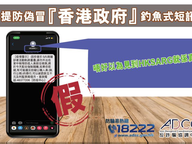 警方今日(7日)在社交平台发文,指反诈骗协调中心收到热心市民通知,有不法之徒伪冒香港政府,以显示发送者为「HKSARG」向市民发出钓鱼式欺诈手机短讯(SMS),表示市民因为与确诊者活动重叠,需要配合强制隔离,并附有电话5915 4725或4637 7206用作查询。市民致电后发现有操普通话骗徒冒充香港卫生署职员要求提供个人资料。 警方呼吁,纵使收到发送者为「HKSARG」短讯时,亦要小心求证。因为骗徒能够利用应用程式自订发讯人显示名称,另亦切勿随意向陌生人透露个人资料:包括姓名、身份证号码、地址、银行户口号码、网上银行账户及密码。 警方亦提醒市民,可经卫生署卫生防护中心网页或2019冠状病毒病专题网站- 同心抗疫查询相关资料,而在有需要的情况下,可致电卫生防护中心热线(2125 1111/2125 1122)查核获授权人员的身份;卫生署如需要联络市民,会提供相关资料以核实双方的身份,人员亦不会要求市民提供任何敏感的个人资料,如银行账户资料及密码。警方指,如有怀疑,请致电「防骗易18222」热线查询。