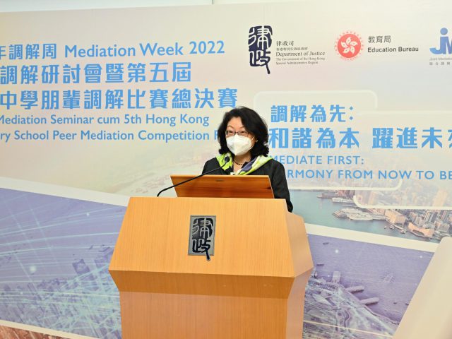 律政司司长郑若骅今日(2日)为2022年调解周的校园调解研讨会暨第五届香港中学朋辈调解比赛总决赛致辞。郑若骅表示,日常生活中无可避免会出现形形色色的纠纷,追求和谐是中国的传统文化,调解以互相尊重和寻求共识的态度去解决冲突,是最理想的做法。 郑若骅说,校园是社会的缩影,处理校园朋辈纠纷,调解是一个更高效、可行性更高的选项。校园朋辈纠纷与一般商事纠纷不同,大多数的朋辈纠纷并不涉及金钱或合约上的争议,反而是来自于同学之间言语上的冲突或者相处上的小矛盾,而朋辈调解非常适合解决这些纠纷。朋辈调解提供中立和保密的平台,由朋辈调解员带领,让学生坦诚交流和表达出自己的想法,而灵活的调解程序容许更大的讨论空间,有助制定双方同意的方案。在处理这些朋辈纠纷时,调解是不可或缺的选项。 郑若骅强调,从小培养调解文化除了有助减少冲突,更可促进构建一个友爱和包容的社会。调解不单止是一门专业服务,更是化解冲突和人与人之间相处的文化。