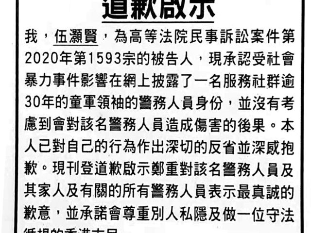 一名警员在黑暴期间被「起底」,涉事青年在报章刊登道歉启事!2020年6月,警方接获举报指一名青年对一名警务人员进行「起底」,将该名警员的个人资料及相片上载到社交网站,令该名警员受到严重滋扰。案件由网络罪案调查科接手调查,涉事青年昨日(19日)在多份报章刊登道歉启事。 市民伍灏贤昨日在报章刊登一篇道歉启事,内容称:「承认受社会暴力事件影响在网上披露了一名服务社群逾30年的童军领袖的警务人员身份,并没有考虑到会对该名警务人员造成伤害的后果。本人已对自己的行为作出深切的反省并深感抱歉。现刊登道歉启事郑重对该名警务人员及其家人及有关的所有警务人员表示最真诚的歉意,并承诺会尊重别人私隐及做一位守法循规的香港市民。」 警方表示,2020年6月,警方收到举报,指一名当时23岁(现年25岁)男子,对一名警务人员进行「起底」,把该名警员的个人资料及相片上载到社交网站。其后有关个人资料于互联网广传,令该名警员受到严重滋扰。案件由网罪科接手调查,并正在咨询律政司意见。据了解,该名警员同时循民事程序跟进事件,涉事人昨日根据要求在报章上刊登道歉启事。 翻查资料,隶属俗称「速龙小队」的警队特别战术小队成员伍×国,于2020年9月18日入禀高等法院,指被人网上「起底」,意图向他作出滋扰及恐吓,要求法庭下令发布者伍灏贤移除有关资讯及停止任何滋扰行为;颁令禁制发布者伍灏贤再针对作出起底及滋扰行为,并作出加重性及惩罚性赔偿。 黑暴至今同类求助逾4000宗 警方续称,自2019年修例事件起,有大量警员及其家属的个人资料被公开及受到滋扰。由2019年6月至今,警方共接获超过4000宗针对司法人员,政府官员,警员及其家属有关被起底的报案求助。警方积极调查、移除资料,并拘捕及起诉多人涉及起底相关罪行,与私隐专员公署合作对「起底」行为执法。 (来源:香港大公报)