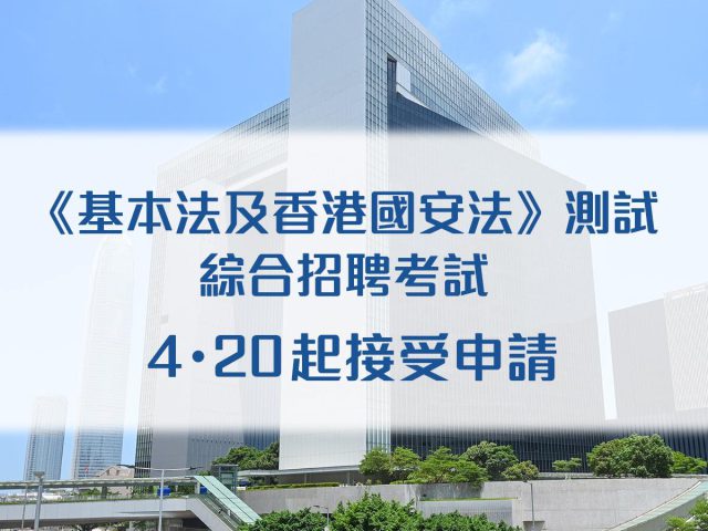 公务员事务局发言人今日(19日)表示,综合招聘考试及《基本法及香港国安法》测试暂定于6月11日及18日或如有需要于6月或7月内的其他日期在香港举行,有意应征学位或专业程度公务员职位的人士可由明日(20日)起报名参加。 发言人表示,政府会因应疫情发展调整安排,并在公务员事务局网页公布,考试人士应留意最新公布。此外,政府要求所有考生和监考人员必须通过「疫苗通行证」的要求,并使用「安心出行」流动应用程式进入试场及在试场内戴上口罩等。如有需要,考试会分多日举行,以减少每日在试场的考生人数及确保考生之间的社交距离。 有意参加考试的人士可由明日起,透过公务员事务局网页的网上申请系统提交申请,或填写综合招聘考试及《基本法及香港国安法》测试申请书(CSB31(3/2022))报考。该申请书可从公务员事务局网页下载,或从民政事务总署各区民政咨询中心或劳工处各就业中心索取(视乎咨询中心及就业中心的运作)。申请人必须于5月3日下午5时前(香港时间)递交申请书。 此外,就所有由今年7月1日起刊登的公务员职位招聘,在新推出的《基本法及香港国安法》测试取得及格成绩会成为所有公务员职位的入职条件。《基本法及香港国安法》测试会考核申请人的《基本法》及《香港国安法》知识。无论公务员职位申请人过往曾否参加由公务员事务局举办的《基本法》测试或在个别局/部门公务员职位(学位╱专业程度职系)招聘过程中安排的《基本法》测试并取得及格成绩,必须在《基本法及香港国安法》测试中取得及格成绩方会获考虑聘用。过往曾参加任何《基本法》测试的人士如欲应征今年7月1日起刊登的公务员职位,亦须参加《基本法及香港国安法》测试并取得及格成绩,方会获考虑聘用。 《基本法及香港国安法》测试(学位/专业程度职系)是一张设有中英文版本的选择题形式试卷,全卷共20题,考生须于30分钟内完成。考生如在20题中答对10题或以上,会被视为取得《基本法及香港国安法》测试(学位/专业程度职系)的及格成绩,有关成绩可用于申请所有公务员职位。