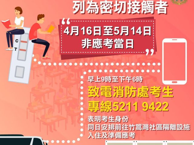 香港2022年中学文凭试(DSE)将如期于4月22日开考,竹篙湾设特别考场供确诊或检疫考生应试。消防处昨日(12日)宣布,将设置消防处考生专线,如果考生于4月16日至5月14日确诊或被列为密切接触者,而非当日应考,就可以在上午9点至下午6点联络消防处考生专线(5211 9422),表明考生身份,消防处会同日安排抗疫专车,接载考生到竹篙湾入住社区隔离设施,准备应考,费用全免。 若考生在应考当日确诊,或者被列为密切接触者,就要先通知考评局公开考试资讯中心(3628 8860),再联络抗疫的士热线(3693 4770),预约抗疫的士前往竹篙湾社区隔离设施应考。抗疫的士热线于早上6时至8时专为考生服务。消防处亦提醒考生要带备准考证正本、身份证正本及行李,在预约位置登车。 考评局公开考试资讯中心热线(3628 8860) 应考考生抗疫的士热线(3693 4770) 消防处考生专线(5211 9422)