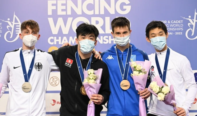 郑铁男(左二)成为香港第四位剑击世青冠军。 香港再产生剑击世青冠军。17岁的郑铁男在阿联酋迪拜举行的世界青少年锦标赛U17花剑项目决赛,以15:6击败德国的对手,成为继张艺馨、张家朗及佘缮妡后,香港第四位剑击世青冠军。 郑铁男赛后表示,感到非常兴奋,指他2019年在波兰同一项赛事早段出局,如今兑现对自己的承诺,登上颁奖台领取金牌。