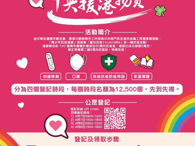 由中华全国青年联合会、香港中联办青年工作部等中央部门和驻港机构牵头推动,中国红十字会和各级红会组织积极动员,中国移动、香港电讯、京东、腾讯、碧桂园、以岭药业等多家本港和内地机构慷慨捐助,价值超过1.5亿元的中央援港物资近日到港,将由「青少年抗疫连线」面向全港青少年及儿童家庭陆续派发,总体目标派出30万份。连线已成功派发5万份,现时第二轮抗疫包派发详情如下: 登记时间:今日(4月7日)0900-1200、1500-1800;4月8日0900-1200、1500-1800。(每个时段名额为12500个) 登记连结:https://www.gba12355.com/youandme/ 派发方式:网上预约登记(先到先得) 第二轮派发数量:5万个抗疫包(包括新冠病毒快速检测剂、儿童及成人口罩、抗疫防疫用品、超过200G流量数据卡、大湾区资讯通、大湾区青年卡等,价值约800港元) 登记时只需要填写姓名、电话及身份证字母连头3个数字,并选择领取时间及领取站(领取站遍布18区),领取地点及时间㇐经提交不能更改或逾时领取。 成功登记者将收到短讯确认抗疫包领取地点及时间。居家抗疫者可由家人或亲友代领,代领者只需到领取站出示登记者身份证(正本/副本/身份证截图)以核对身份便可。下㇐轮登记详情将稍后公布,请密切留意。 「青少年抗疫连线」将持续更新并发布一系列抗疫活动资讯,敬请留意。若对登记程序有疑问,可WhatsApp 5731 2355 或致电12355热线查询。