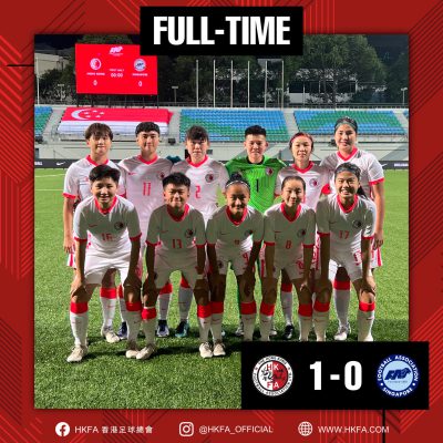 香港女子足球代表队昨(26日)晚在新加坡进行第二场友赛,最终以1:0击败对手。这是香港女足继上星期四4:0大胜对手之后,再度取胜,结果以两战两胜结束新加坡之旅。 港队今场的唯一入球在22分钟出现,港队一个角球攻势,曾丽薇近门射入,奠定胜局。队长陈咏诗及梁匡荞分别有黄金机会,但都先后中楣弹出或被对方门将扑出,未能扩大领先优势,港队最终保持胜果至完场。赛后陈咏诗获选为今场最佳球员。