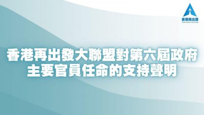 中央人民政府今日(19日)正式任命香港特别行政区第六届政府的主要官员,香港再出发大联盟对此任命表示坚决支持,并向每一位受任命官员表示祝贺,期望他们在未来的工作中,坚定爱国爱港信念、团结香港社会,发挥所长,共同协助第六任行政长官李家超高效施政、排除万难,开创香港新篇章! 本次任命的主要官员来自不同界别,具有广泛性、专业性以及多样性等的特点。其中包括上一届的官员、公务员、立法会议员以及社会商界人士,香港再出发大联盟表示,相信他们定能为新一届特区政府的施政提供宝贵的经验,协助行政长官为民办实事。 世界现时正处于百年未有的大变局中,后疫情时代的到来以及单边主义的兴起都给香港未来的发展带来挑战。香港再出发大联盟希望新一届政府官员一定要牢记港澳办主任夏宝龙提出的有关实现良政善治的「五个善于」,积极解决香港深层次问题,落实以人民为中心的理念,克服疫情,发展经济,更积极融入国家发展大局,从而保障「一国两制」在香港的行稳致远,维持香港繁荣和稳定! 香港再出发大联盟强调,将一如既往拥护「一国两制」、坚定支持特区政府依法施政,和社会各界戮力同心,支持新一届特区政府开新局、谱新篇,传承「爱国者」精神助力中华民族伟大复兴!