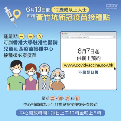 香港12岁或以上人士下周一可到黄竹坑疫苗接种点打复必泰 今起供预约