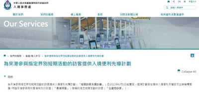 为方便营商及提升香港国际地位,政府明日(6月1日)推出「为来港参与指定界别短期活动的访客提供入境便利先导计划」,涵盖医疗卫生、高等教育、文化艺术、体育、文物、创意产业、创新及科技、香港桂冠论坛、航空、国际/大型活动十个界别,为来港参与指定界别短期活动的访客提供入境便利。 先导计划下,获政府相关决策局/部门认可的机构可向界别内相关的非本地人才发出邀请信,获邀人士可以访客身份来港参与指定短期活动,而无须向入境事务处申请工作签证/进入许可。获邀的非本地人才须为本地短缺的人才或其来港出席指定短期活动有助经济发展或达致相关政策目标,他们每次来港可在不超过14日期间参与指定短期活动,并可就该指定活动收取报酬。 政府表示,先导计划为期两年。为落实计划和监察计划的实施情况,有关决策局/部门已向其界别内获认可机构发出入境处的指引,并设立汇报和联络机制。此外,政府现时为一般非本地讲者提供的入境便利将进一步放宽。由明日起,所有非本地讲者在无须申请工作签证/进入许可的情况下,每次来港可连续14日(原有上限为7日)进行演讲╱作出发布,而可参与演讲╱发布活动的上限亦将撤销,但他们不可接受报酬的条件则维持不变(因应有关活动而获提供住宿、交通、膳食等费用除外)。 政府指,须持有旅游签证/进入许可才可进入香港的人士亦可受惠于先导计划和为非本地讲者提供的便利(即他们无须另行申请工作签证/进入许可),惟他们仍须申请旅游签证/进入许可。所有入境人士须接受访港入境管制,包括按照适用的法律、政策和惯例在抵港时接受入境检查。他们亦受新冠病毒疫情下适用的入境要求所规限。 详情↓ 目的 为来港参与指定界别短期活动的访客提供入境便利先导计划(「短期访客先导计划」)自202 2年6月1日起实施。这项计划旨在提供入境便利予获认可主办机构邀请╱保证来港参与有利香港特别行政区(「香港特区」)发展的指定短期活动的访客(「合资格访客」)。 概述 根据香港法例《入境规例》(第115 A章)第2(1 )条的规定,给予某人以访客身分在香港入境的准许,须受下述逗留条件规限: 该人不得接受有薪或无薪的雇佣工作; 该人不得开办或参与任何业务;及 该人不得就读于学校、大学或其他教育机构。 根据香港法例《入境条例》(第11 5章)第4 1条,任何人违反对他有效的逗留条件,即属犯罪,经定罪后,最高可判罚款港币五万元及监禁两年。 短期访客先导计划下的入境便利措施 根据短期访客先导计划,合资格访客来港参与指定短期活动无须申请工作签证╱进入许可。合资格访客每次获准以访客身分逗留期间(即每次入境香港特区)参与指定短期活动的期限为不超过连续1 4个历日(由开始参与该些活动当日起计),而合资格访客在该1 4日期间可参与指定短期活动的数目则不设上限。 1 0个指定界别下的指定活动 短期访客先导计划涵盖获相关政府决策局/部门支持的1 0个界别,受惠对象获得邀请,是因为他们属于该界别短缺的人才,或是因为他们参与有关的短期活动有助达致某些政策目标。1 0个指定界别的详情如下: 指定界别 相关政府决策局/部门 联络资料 (电话及电邮地址) 1 医疗卫生 食物及卫生局 (852) 3509 8765 [email protected] k 2 高等教育 教育局 (香港演艺学院以外的主办机构) (852) 2804 6499 [email protected] k 民政事务局 (香港演艺学院作为主办机构) (852) 3509 7076 [email protected] k 3 文化艺术 民政事务局 (852) 3509 7076 [email protected] k 4 体育 民政事务局 (852) 3509 7059 [email protected] k 5 文物 古物古迹办事处 (852) 2208 4488 [email protected] k 6 创意产业 商务及经济发展局 (852) 3655 5595 [email protected] k 7 创新及科技 创新及科技局 (852) 3655 4787 [email protected] k 8 香港桂冠论坛 政策创新与统筹办事处 (852)...