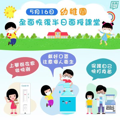 本港第五波疫情缓和,幼稚园今日(16日)起全面恢复半日面授课堂。 政府通过社交平台「添马台」发文,为家长送上3条贴士: 上学前预留足够时间给子女做快速测试 提醒幼童戴好口罩,保持个人卫生 尽早带他们接种疫苗,现时接种科兴疫苗的最低年龄为3岁,而接种复必泰疫苗的最低年龄则为5岁 政府提醒家长,幼童抵抗力较低,要保护他们免受新冠病毒的伤害,接种疫苗是唯一和最有效的方法。 继小学4月19日起陆续恢复面授课后,全港中学及幼稚园5月3日起分阶段恢复面授课。所有学生早上回校前,都须在家先进行快速病毒测试,阴性才准回校。