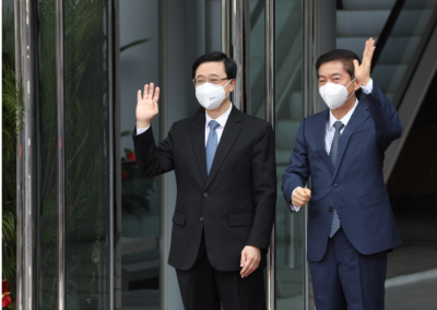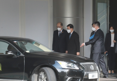 第六届行政长官选举于昨日(8日)顺利举行,候选人李家超获得1416张支持票,高票当选第六任行政长官人选。李家超今日(9日)下午4时,前往铜锣湾中央驻港国安公署作礼节性拜会,约半小时后离开。中央驻港国安公署署长郑雁雄、副署长李江舟及孙青野等陪伴李家超离开,李家超登车前热情地与大家碰手。