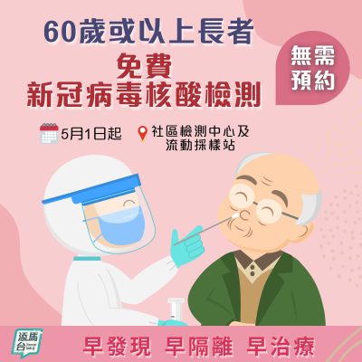 香港第五波疫情缓和,政府今日(6日)在社交专页「添马台」发文,指为鼓励较高感染风险长者不时进行新冠病毒检测,以达致「早发现、早隔离、早治疗」,60岁或以上长者现可免费进行核酸检测。 政府指,长者可于全港各区约100个社区检测中心及流动采样站,接受由专业人员采样的新冠病毒核酸检测,费用全免,无需预约。 另外,政府呼吁,尚未接种新冠疫苗的长者如检测结果为阴性,应尽快接种疫苗保护自己。