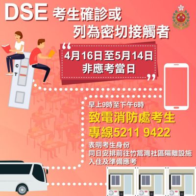 香港2022年中学文凭试(DSE)将如期于4月22日开考,竹篙湾设特别考场供确诊或检疫考生应试。消防处昨日(12日)宣布,将设置消防处考生专线,如果考生于4月16日至5月14日确诊或被列为密切接触者,而非当日应考,就可以在上午9点至下午6点联络消防处考生专线(5211 9422),表明考生身份,消防处会同日安排抗疫专车,接载考生到竹篙湾入住社区隔离设施,准备应考,费用全免。 若考生在应考当日确诊,或者被列为密切接触者,就要先通知考评局公开考试资讯中心(3628 8860),再联络抗疫的士热线(3693 4770),预约抗疫的士前往竹篙湾社区隔离设施应考。抗疫的士热线于早上6时至8时专为考生服务。消防处亦提醒考生要带备准考证正本、身份证正本及行李,在预约位置登车。 考评局公开考试资讯中心热线(3628 8860) 应考考生抗疫的士热线(3693 4770) 消防处考生专线(5211 9422)