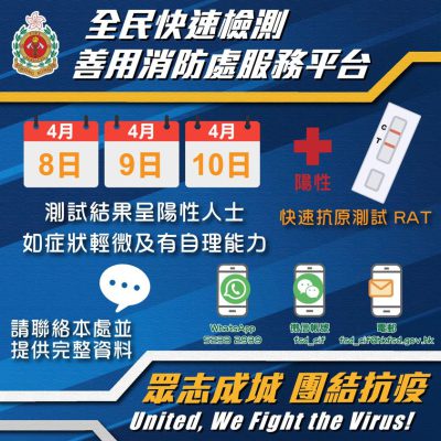 香港特区政府呼吁全港市民今日(8日)起一连三日每日进行快速抗原测试,以便了解社区感染情况,早日截断病毒传播,帮助社会尽快复常。消防处表示,经快速抗原测试呈阳性市民,如果症状轻微并有自理能力,可求助消防处,当局会尽快安排有需要的市民入住社区隔离设施。 消防处联络方式: WhatsApp(按下连结传送信息:https://wa.me/85252332939?text=我需要入住隔离设施) 电邮:[email protected] 微信帐号:fsd_cif 提供所需的个人资料: 中文及英文姓名(须与证件姓名相同) 年龄 性别 证件号码(例A1234xxx) 电话号码 住址 检测方法(1核酸测试/2深喉唾液测试/3快速抗原测试) 检测呈阳性结果的日期