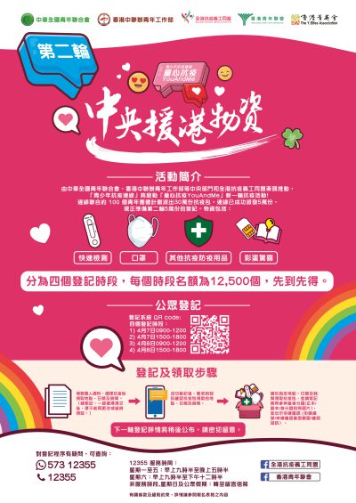 由中华全国青年联合会、香港中联办青年工作部等中央部门和驻港机构牵头推动,中国红十字会和各级红会组织积极动员,中国移动、香港电讯、京东、腾讯、碧桂园、以岭药业等多家本港和内地机构慷慨捐助,价值超过1.5亿元的中央援港物资近日到港,将由「青少年抗疫连线」面向全港青少年及儿童家庭陆续派发,总体目标派出30万份。连线已成功派发5万份,现时第二轮抗疫包派发详情如下: 登记时间:今日(4月7日)0900-1200、1500-1800;4月8日0900-1200、1500-1800。(每个时段名额为12500个) 登记连结:https://www.gba12355.com/youandme/ 派发方式:网上预约登记(先到先得) 第二轮派发数量:5万个抗疫包(包括新冠病毒快速检测剂、儿童及成人口罩、抗疫防疫用品、超过200G流量数据卡、大湾区资讯通、大湾区青年卡等,价值约800港元) 登记时只需要填写姓名、电话及身份证字母连头3个数字,并选择领取时间及领取站(领取站遍布18区),领取地点及时间㇐经提交不能更改或逾时领取。 成功登记者将收到短讯确认抗疫包领取地点及时间。居家抗疫者可由家人或亲友代领,代领者只需到领取站出示登记者身份证(正本/副本/身份证截图)以核对身份便可。下㇐轮登记详情将稍后公布,请密切留意。 「青少年抗疫连线」将持续更新并发布一系列抗疫活动资讯,敬请留意。若对登记程序有疑问,可WhatsApp 5731 2355 或致电12355热线查询。