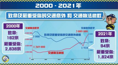 香港警方今日(28日)在社交媒体公布2000至2021年致命及严重受伤交通意外和交通执法总结。2021年全年一共发生94宗致命交通意外,并有97人在意外中不幸去世,数字为1954年以来最低。此外,致命及严重受伤的交通意外数字由2000年的3000宗,每年平均减少2%,下跌至2021年的1918宗;相比2020年的2008宗,下跌约4.5%。 警方表示,多年来不断加强交通执法力度,交通执法数字由2000年接近140万,平均每年递增5%,增加至2021年接近390万。而2021年对比2020约320万的执法数字,更大幅增加20%。警方近年引入新的执法工具,例如电子告票及快速口腔液测试等,大大提高执法成效及阻吓性,亦展示出警方打击与交通相关罪行的决心。