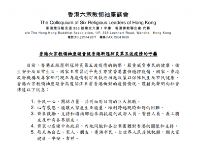 本港第五波疫情大爆发,连日确诊数以千计。香港六宗教领袖座谈会高度关注目前香港面对的疫情情况,今日(18日)发起声明呼吁全民一心,团结力量,共同面对目前的巨大挑战。 声明指,香港正经历新冠肺炎第五波疫情的冲击,严重威胁市民的健康、卫生安全及日常生活。国家主席习近平亦望香港尽快稳控疫情,国家、香港政府机构及专家部门现正为疫情制订及执行相应政策以保障民生及巿民健康,声明表示衷心感谢中央政府、内地同胞和各企业团体对香港的关怀和支持。 香港佛教联合会、天主教香港教区、孔教学院院长、中华回教博爱社、香港基督教协进会及香港道教联合会联合呼吁,要心存感恩,让大家产生正能量,顺利跨越现时面对的困难,同时鼓励、支持和赞扬那些参与抗疫的政府人员、医务人员、义工朋友及所有各界朋友,又呼吁每天为自己、家人、朋友、香港市民、全世界人民虔诚祝愿。