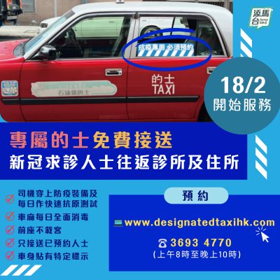 本港第5波新冠疫情严峻,大量初步确诊患者滞留社区,「抗疫的士」今日(18日)起投入服务,免费接送新冠求诊人士返往诊所及住所。 专属车队有约300辆车,司机及车辆均须遵从防疫抗疫指引,的士会在车窗贴上「抗疫专用必须预约」蓝色贴纸以作识别。 已预约指定诊所服务的求诊人士可由今日上午7时起,透过专设的预约平台,或由同日起每日上午8时至晚上10时致电3693 4770预约专属车队服务。