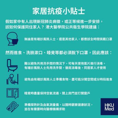 本港第五波疫情大爆发,确诊数字连日倍数增长,医疗系统压力剧增,不少怀疑染疫人士只能在家中等候政府进一步安排,同时担心自己会传染给同住家人。港大医学院公共卫生学院今日(15日)提出建议,表示假如家中有人出现病征,又或者正在等候进一步的安排,可以采取五项措施,包括怀疑染疫人士及同住家人都应该全时间佩戴口罩。 居家抗疫可以采取以下五项措施: 一、无论是有确诊风险人士,还是其他家人,都应该全时间佩戴口罩;(吃饭、洗脸漱口、睡觉脱下口罩时应采取以下措施) 二、难以避免共用洗手间的情况下,可每天使用氯片进行消毒。有确诊风险人士先用洗手间,彻底消毒后,同居家人才使用; 三、避免由有确诊风险人士准备食物,尽可能分开空间或分时段进食; 四、睡觉时尽量保持空气流通,关上房门并打开窗户; 五、可考虑准备探热针及血氧测量仪,以随时观察健康状况,并在有需要时向医疗机构求助。