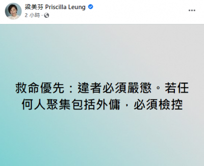 本港第5波疫情严峻。立法会议员梁美芬今日(15日)于社交媒体发文指出,政策应以「救命」优先,并需严惩违法人士。 梁美芬表示,政策应以「救命」优先,扩建方舱医院救治感染者刻不容缓,并呼吁政府协调非政府组织、政府的空置校舍以及宗教团体开放空置场地,让确诊病人接受隔离。 她指出,必须严惩违法人士。若执法人员发现有任何人聚集,包括外佣等,亦必须检控。她形容,「抗疫就是一场战争,一定要滴水不漏对抗敌人」。