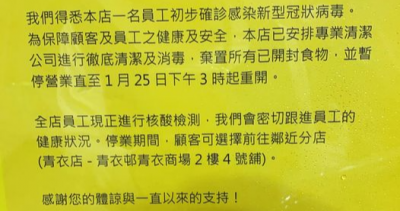 青衣长亨商场惠康今日(25日)有一名员工初步确诊。据该店贴出的告示,指得悉一名员工初确,惠康已安排彻底清洁及消毒,同时弃置所有已开封食物,该店会暂停营业至今日下午3时重开。 本港昨日(24日)新增109宗确诊个案,其中葵涌村逸葵楼增27宗,村内已逾200宗病例,染疫大厦目增至11幢。