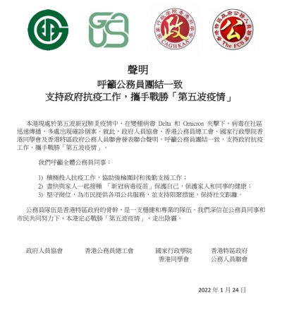 四个公务员工会今日(24日)发表联合声明,呼吁公务员团结一致,坚守岗位,尽快接种疫苗,支持政府抗疫工作,携手战胜「第五波疫情」。 参与声明的工会包括政府人员协会、香港公务员总工会、国家行政学院香港同学会及香港特区政府公务人员联会。发言人表示,香港现处于第五波新冠肺炎疫情,变种病毒Delta 和Omicron 夹击下,病毒在社区迅速传播,多处出现确诊个案。工会呼吁全体公务员同事,积极投入抗疫工作,协助强检围封和后勤支援工作;尽快与家人一起接种「新冠病毒疫苖」保护自己,保护家人和同事的健康;坚守岗位,为市民提供各项公共服务,并支持限聚措施,保持社交距离。 发言人表示,公务员队伍是香港特区政府的骨干,是一支稳健和专业的队伍,深信在公务员同事和市民共同努力下,定必战胜「第五波疫情」,走出阴霾。
