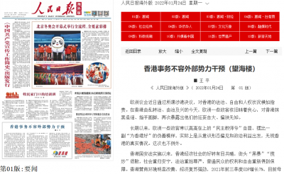 《人民日报》海外版今日(24日)发表评论员文章再次强调,香港事务不容外部势力干预。 文章表示,欧洲议会近日通过所谓涉港决议,对香港的法治、自由和人权状况横加指责,批评欧洲一些政客常以高高在上的「民主教师爷」自居,摆出一副「为香港好」的伪善模样,实际上是从意识形态偏见和政治利益出发,无视香港的真实情况。 文章表示,香港营商环境明显改善,经济复苏强劲;在修改完善的选举制度下,去除「泛政治化」,杜绝「港独」「反中」政治秀,回归专业和理性。 文章认为,香港越好,欧洲一些政客越着急,是因为他们从根本上就站在香港利益对立面。中欧合作发展是大势所趋,香港的繁荣稳定也关系到超过2300家欧盟在港企业和35万在港欧盟公民的利益。香港的繁荣稳定源自祖国支持和自身奋斗,无须那些别有用心的外国政客操心,敦促欧洲议会恪守国际法和国际关系基本准则,停止干涉中国内政、干预香港事务,改一改充当「民主教师爷」的老毛病。