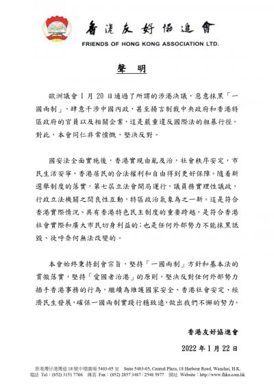 、 欧洲议会前日(20日)通过了所谓的涉港决议,恶意抹黑「一国两制」,肆意干涉中国内政,甚至扬言制裁中央政府和香港特区政府的官员以及相关企业,这是严重违反国际法的粗暴行径。对此,香港友好协进会表示非常愤慨,坚决反对。 香港友好协进会指出,国安法全面实施后,香港实现由乱及治,社会秩序安定,市民生活安宁,香港居民的合法权利和自由得到更好保障。随着新选举制度的落实,第七届立法会开局运行,议员务实理性议政,行政立法机关之间良性互动,特区政治气象为之一新。这是符合香港实际情况、具有香港特色民主制度的重要跨越,是符合香港社会实际和广大市民切身利益的;也是任何外部势力不能抹黑诋毁、徒呼奈何无法改变的。 香港友好协进会强调,本会始终秉持创会宗旨,坚持「一国两制」方针和基本法的贯彻落实,坚持「爱国者治港」的原则,坚决反对任何外部势力插手香港事务的行为,继续为维护国家安全、香港社会安定、经济民生发展,确保「一国两制」实践行稳致远,做出我们不懈的努力。