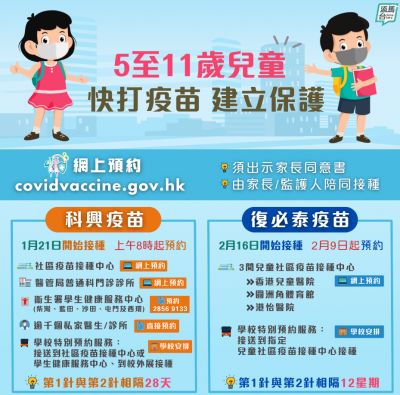 新冠肺炎变异病毒株传播力强,政府大力呼吁市民接种新冠疫苗加强保护。而本港5至11岁的儿童,由今日(21日)起可以接种科兴疫苗,并已于今早8时起提供网上预约;至于复必泰疫苗则由2月9日起预约,2月16日开始接种。 儿童必须在接种疫苗当日携同已签妥的家长同意书,并由家长/监护人亲自陪同前往接种疫苗。而儿童与成人一样,接种第一剂与第二剂科兴疫苗需要相隔28日。而在预约接种新冠疫苗前,要特别留意接种新冠疫苗和其他疫苗(包括季节性流感疫苗)之间须相隔最少14日。