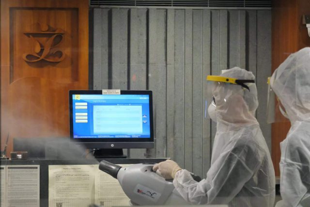 湾仔湾景中心一间餐厅周一晚举办百人聚餐,出席宾客中涉一宗初步确诊个案,当晚除有多名官员到场外,还有多名立法会议员出席。有清洁公司今晚到立法会综合大楼的议员楼层和中信大厦的议员楼层进行清洁消毒。 消息指,最少有10名议员出席过有关宴会,包括民建联议员陈仲尼、经民联议员陆瀚民和科技创新界议员邱达根等人。立法会主席梁君彦提醒他们,无论有否接触初步确诊者,都应该做检测,在未有结果前不要返回大楼。若助理担心,亦应采取相应措施。 立法会秘书处指相关议员及助理已进行检测,在取得阴性检测结果前不会返回立法会大楼及中信大厦的议员楼层,秘书处亦已安排清洁公司在综合大楼的议员楼层和餐厅等公众地方,以及中信大厦13及15楼的议员楼层进行消毒。 晚上8时许,身穿全套白色装备的清洁人员在立法会进行全面清洁消毒,又在走廊等位置喷洒消毒药水。