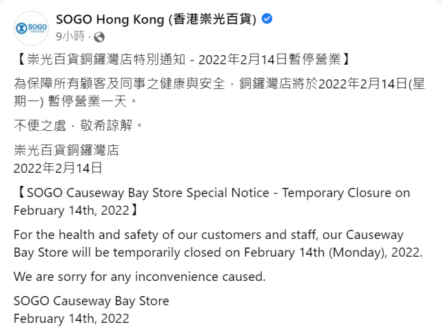 崇光百货今日(14日)凌晨在社交网站Facebook发通告,指铜锣湾店今日暂停营业一天,惟未有详细交代原因。 崇光百货表示,为保障所有顾客及同事之健康与安全,崇光百货铜锣湾店于今日(14日)暂停营业一天。 崇光百货铜锣湾店月初曾因有员工初步确诊,在2月5日及6日暂停营业,并安排全店的深度清洁及雾化消毒工作,包括所有设施和设备、各楼层空间等,同事亦需即时进行新型冠状病毒核酸测试。