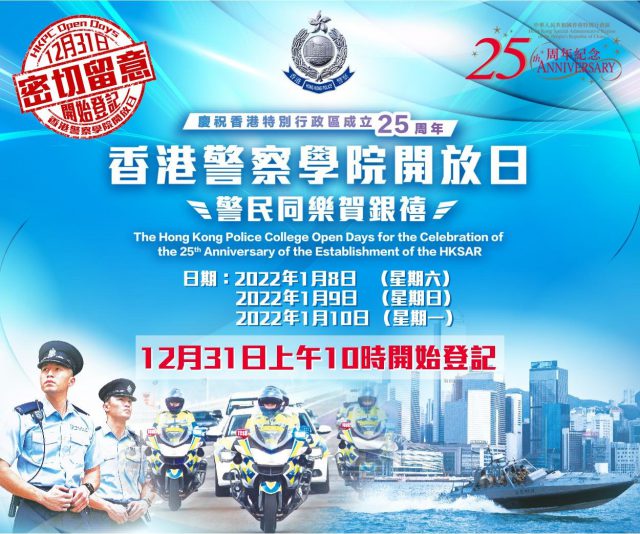 香港警方昨日(29日)在社交平台公布,为庆祝香港回归25周年,顺贺每年1月10日的中国人民警察节,警察学院将于明年1月8至10日期间举行开放日,与市民同乐。登记系统将由本周五(31日)至下月2日每日上午10时开放予公众登记各场门票,成功登记者将获电邮通知,并用二维码入场。 警方指,开放日节目丰富,分别有五个主题区域,其中主要的表演包括《警察大汇演》,市民可安坐大操场看台观赏升旗仪式及中式步操表演、警察乐队演奏、警犬表演、警队护送组驾驶技术示范及警队特别队伍的反恐演练。其他主题区域活动包括国家安全资讯展览、警队专业装备展示、亲子玩乐区、摊位游戏及精彩表演。