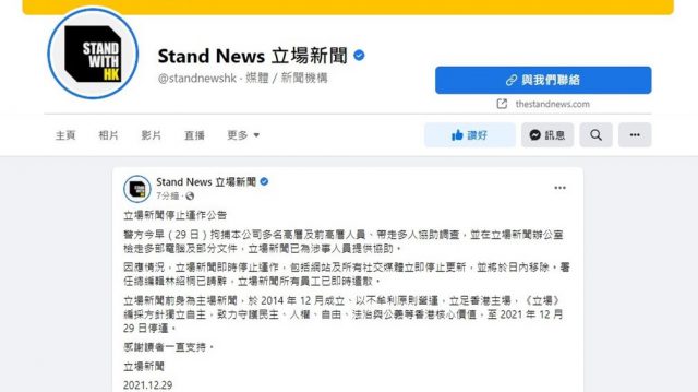 警方国安处今日(29日)拘捕7人,其中6人为《立场新闻》高层或前高层人员(3男3女),年龄介乎34岁至73岁;另1人则为正在还柙的前《苹果日报》副社长陈沛敏。7人涉违反《刑事罪行条例》第9及10条串谋发布煽动刊物罪,警方搜查被捕人士的处所,各人随后被押往不同警署扣查。被捕的7人当中,钟沛权和陈沛敏为夫妻关系。 《立场新闻》下午即在社交平台表示,因应警方拘捕多名高层及前高层人员、带走多人协助调查,并在《立场新闻》办公室检走多部电脑及部分文件,《立场新闻》决定即时停止运作,包括网站及所有社交媒体立即停止更新,并将于日内移除。署任总编辑林绍桐已请辞,《立场新闻》所有员工已即时遣散。