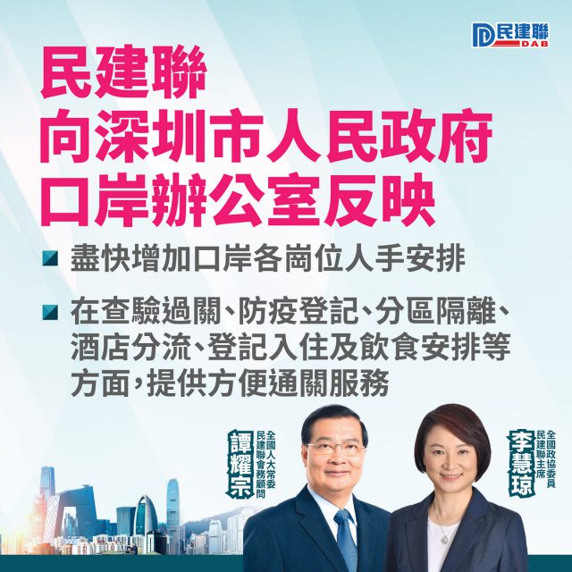近日不少港人过关回内地,期望赶及在内地过农历新年,深圳湾口岸连日来出现排队人龙。全国人大常委会委员谭耀宗联同全国政协委员、民建联主席李慧琼,今日去信深圳市人民政府口岸办公室,希望深圳当局增加口岸人手安排,处理过关、防疫登记、酒店分流、饮食安排等。 两人在信中表示,年关将至,大批港人打算回内地过农历新年,为赶及完成21日检疫隔离期,近日赶着过关返乡,造成口岸区域出现大量人潮,经深圳湾口岸过关的港人,排队人龙在内地入境管制区已倒灌至香港出境管制区,在场等候过关人士最少要轮候至少6小时以上才能过关,不少人因长时间排队而疲累不堪。 两人又指,据悉,由于内地口岸边检人手不多,要严谨检查入境港人的核酸检测结果,加上在深圳一方要再接受采样检测,令过关时间大大延长,因此希望深圳当局能够及时处理。