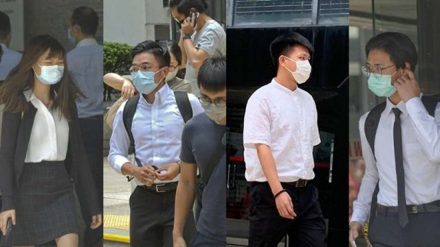左起:曾倩仪、江镜棠、陈国威及陈霆堃。 前年11月理大冲突爆发期间,大批示威者前往「声援」,并在附近的佐敦道拔萃女书院外参与暴动,其中九人被捕。他们经审讯后,今日在区院全部被裁定暴动罪名成立。 九名被告依次为陈国威(学生,19岁)、陈子谦(会计文员,27岁)、江镜棠(工程师,26岁)、陈霆堃(学生,18岁)、黄适哲(学生,21岁)、梁嘉星(毛记葵涌设计师,23岁)、曾倩仪(银行职员,24岁)、邓锦乐(无业,23岁)及詹隆享(测量主任,26岁),被控于前年11月18日,在油麻地加士居道拔萃女书院外与其他身份不详者参与暴动。 另外,两名被告梁嘉星及詹隆享各被控一项管有攻击性武器或适合作非法用途的工具罪,指梁嘉星于同日同地管有一把剪刀及一罐打火机燃料;詹隆享管有一支六角匙及一把板手。 由左上至下:黄适哲、邓锦乐、詹隆享、梁嘉星及陈子谦。 法官林伟权裁决时表示,案发时现场示威者向警方投掷砖头及燃烧弹,是破坏社会安宁的暴力行为,构成暴动。另有示威者手持燃烧弹等攻击性武器,令人相信他们很快会使用有关物品攻击目标,相当可能造成人身伤害或公私财产损毁,构成迫切的破坏社会安宁的暴力,现场的非法集结成为暴动。 法官称,九名被告被捕时,穿戴头盔、护目镜、防毒面罩及手套等装备,其中被告曾倩仪被捕时持有燃烧弹,认为九人是蓄意装备自己到场参与暴动,并非刚巧路过或旁观,他们不理会警方发射催泪弹及警告选择留下,成为暴动人群的一分子,是要借人群声威,鼓励及支持破坏社会安宁的暴力行为。 法官提到,第六被告管有剪刀及打火机燃料,肯定是打算在暴动中制造燃烧弹或纵火,以及作出掘砖等暴动相关非法行为;第九被告管有六角匙及扳手,肯定是打算拆掉路边栏杆或路牌,裁定两人管有攻击性武器或适合作非法用途的工具罪成。