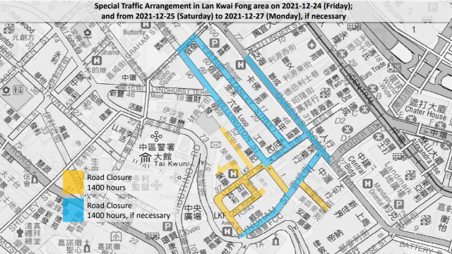圣诞将至,警方表示,将于12月24日(星期五)至12月25日(星期六)在中区兰桂坊实施特别交通安排,以方便市民庆祝圣诞。 警方指出,12月24日下午2时至12月25日上午5时,介乎云咸街与威灵顿街的德己立街、兰桂坊、荣华里、和安里、介乎云咸街与德己立街的威灵顿街、安兰街将封闭;视乎人潮情况,介乎德己立街与阁麟街的士丹利街、介乎己连拿利与皇后大道中的云咸街、介乎皇后大道中与威灵顿街的德己立街、介乎德己立街与阁麟街的威灵顿街、介乎威灵顿街与士丹利街的阁麟街、摆花街、介乎毕打街与砵典乍街的皇后大道中或会封闭;在交通改道措施完成后,警方将指示人群沿皇后大道中、德己立街、士丹利街、阁麟街及威灵顿街轮候,整条德己立街将会禁止车辆驶入。 12月24日下午1时至12月25日上午5时,近德己立街的士丹利街、介乎亚毕诺道与德己立街的云咸街、安兰街路旁停车位暂停使用。在上述范围内非法停泊的车辆,将会在没有事前警告的情况下被拖走或被多次票控。 警方强调,劝喻市民不要携带喷雾剂前往兰桂坊一带范围,或在该范围内喷洒喷雾剂,以免对在场和附近人士造成危险,家长尽量不要携带幼童前往该区。