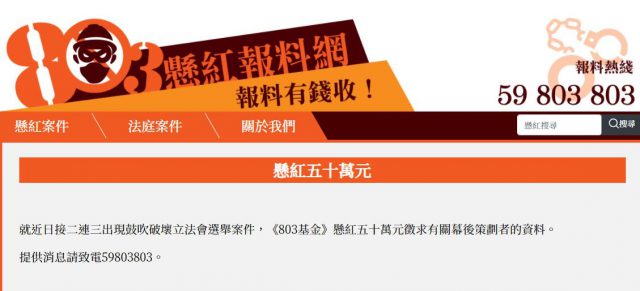 网上有人鼓吹破坏立法会选举「803基金」悬红50万缉幕后黑手